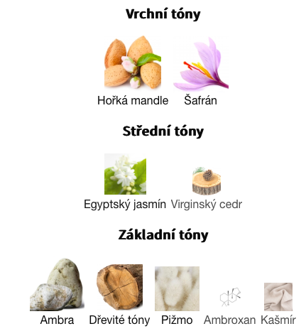Vrchní tóny jsou Hořká mandle a Šafrán;