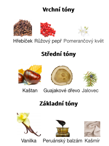 Vrchní tóny jsou Hřebíček, Růžový pepř a Pomerančový květ;