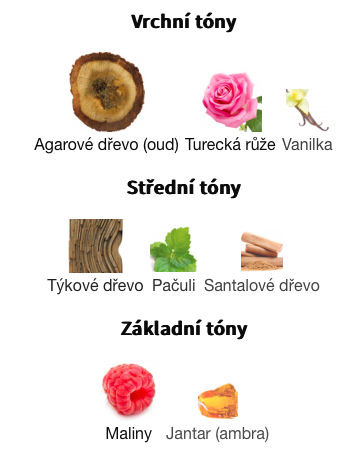 Vrchní tóny jsou Agarové dřevo (oud), Turecká růže a Vanilka