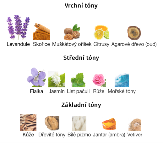 Vrchní tóny jsou Levandule, Skořice, Muškátový oříšek, Citrusy a Agarové dřevo (oud)