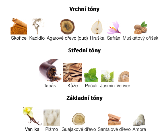 Vrchní tóny jsou Skořice, Kadidlo, Agarové dřevo (oud), Hruška, Šafrán a Muškátový oříšek