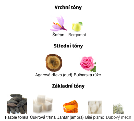 Střední tóny jsou Agarové dřevo (oud) a Bulharská růže