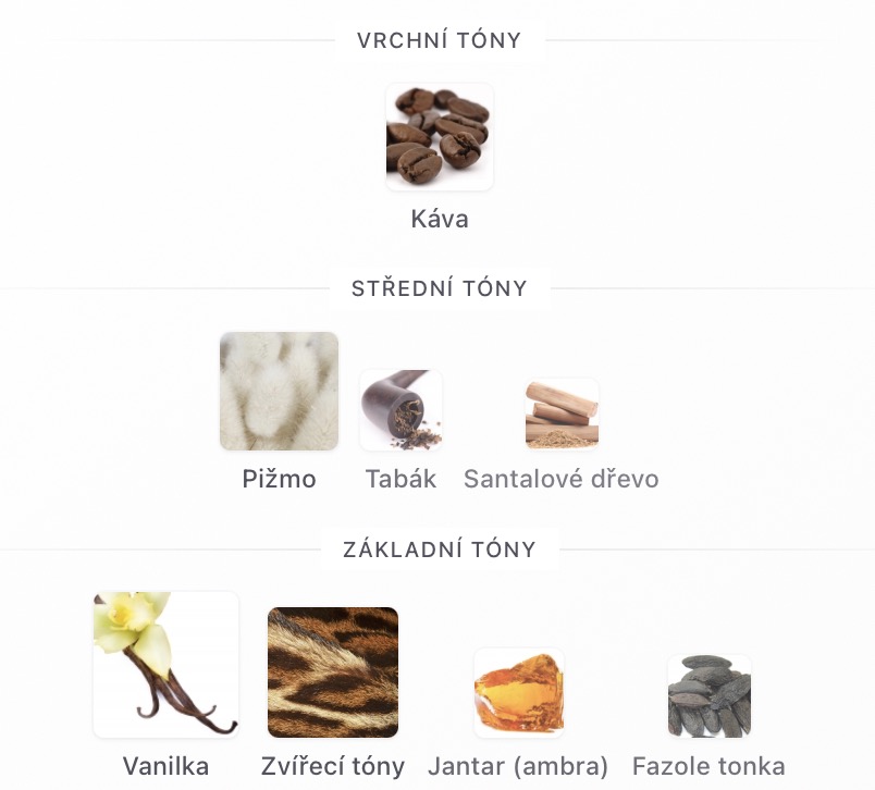 Základní tóny jsou Vanilka, Zvířecí tóny, Jantar (ambra) a Fazole tonka.