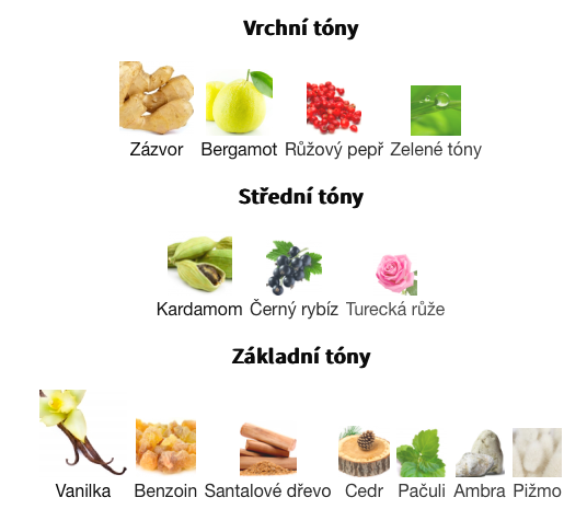 Vrchní tóny jsou Zázvor, Bergamot, Růžový pepř a Zelené tóny