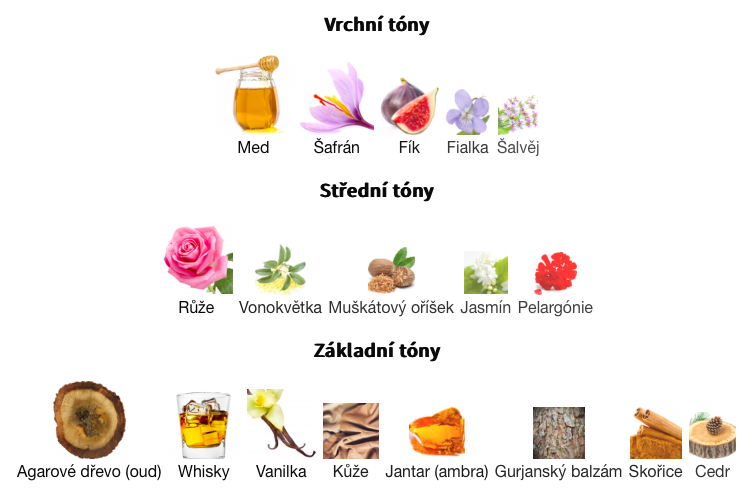 Vrchní tóny jsou Med, Šafrán, Fík, Fialka a Šalvěj;