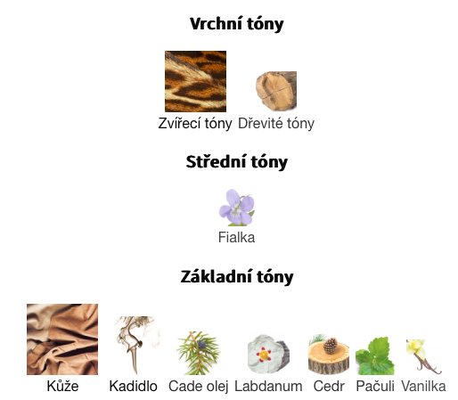 Základní tóny jsou Kůže, Kadidlo, Cade olej, Labdanum, Cedr, Pačuli a Vanilka.