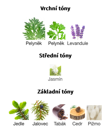Základní tóny jsou Jedle, Jalovec, Tabák, Cedr a Pižmo.