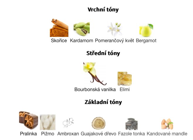 Základní tóny jsou Pralinka, Pižmo, Ambroxan, Guajakové dřevo, Fazole tonka a Kandované mandle.