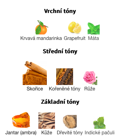 Vrchní tóny jsou Krvavá mandarinka, Grapefruit a Máta