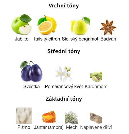 Vrchní tóny jsou Jablko, Italský citrón, Sicilský bergamot a Badyán