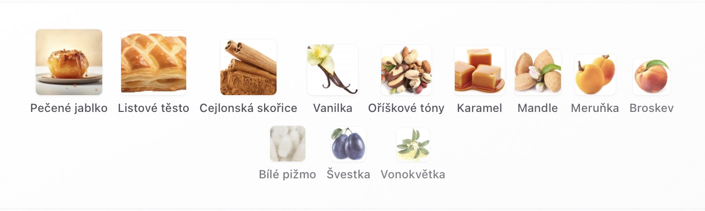 Pečené jablko, Listové těsto, Cejlonská skořice, Vanilka, Oříškové tóny, Karamel, Mandle, Meruňka, Broskev, Bílé pižmo, Švestka a Vonokvětka .
