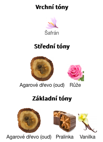 Základní tóny jsou Agarové dřevo (oud), Pralinka a Vanilka.