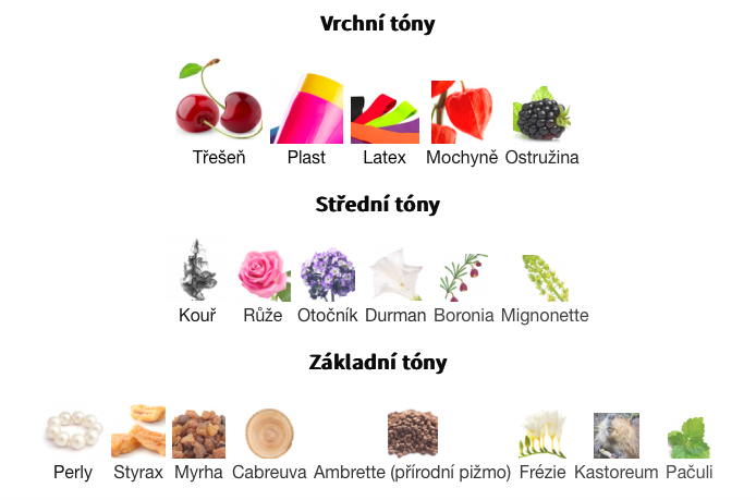 Vrchní tóny jsou Třešeň, Plast, Latex, Mochyně a Ostružina;