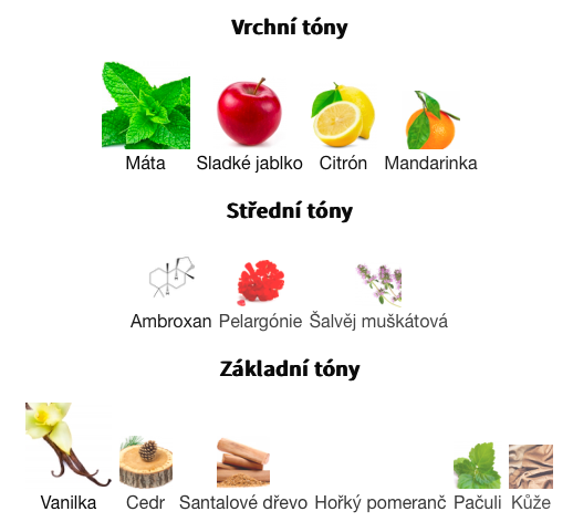 Vrchní tóny jsou Máta, Sladké jablko, Citrón a Mandarinka