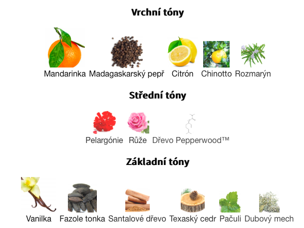 Vrchní tóny jsou Mandarinka, Madagaskarský pepř, Citrón, Chinotto a Rozmarýn;