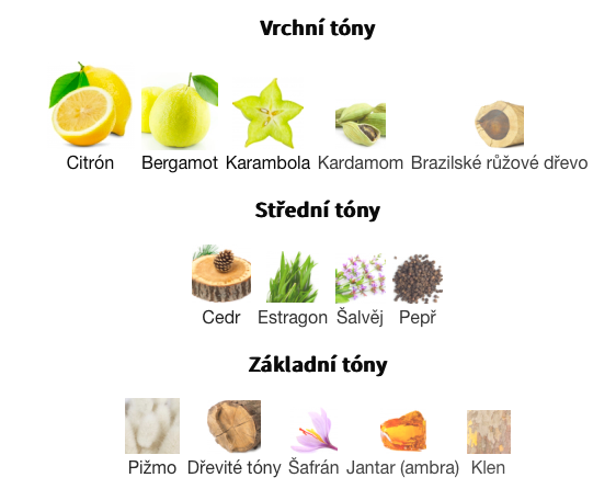 Vrchní tóny jsou Citrón, Bergamot, Karambola, Kardamom a Brazilské růžové dřevo