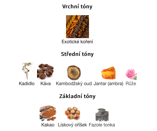 Střední tóny jsou Kadidlo, Káva, Kambodžský oud, Jantar (ambra) a Růže ;