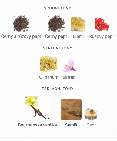 Vrchní tóny jsou Černý a růžový pepř, Černý pepř, Elemi a Růžový pepř;