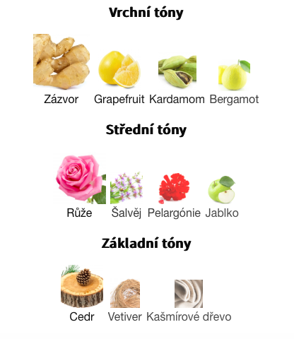 Střední tóny jsou Růže, Šalvěj, Pelargónie a Jablko