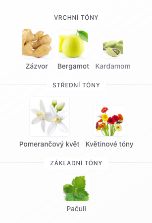 Vrchní tóny jsou Zázvor, Bergamot a Kardamom;
