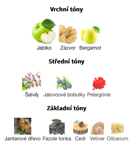 Základní tóny jsou Jantarové dřevo, Fazole tonka, Cedr, Vetiver a Olibanum.